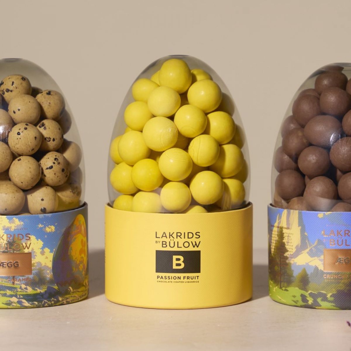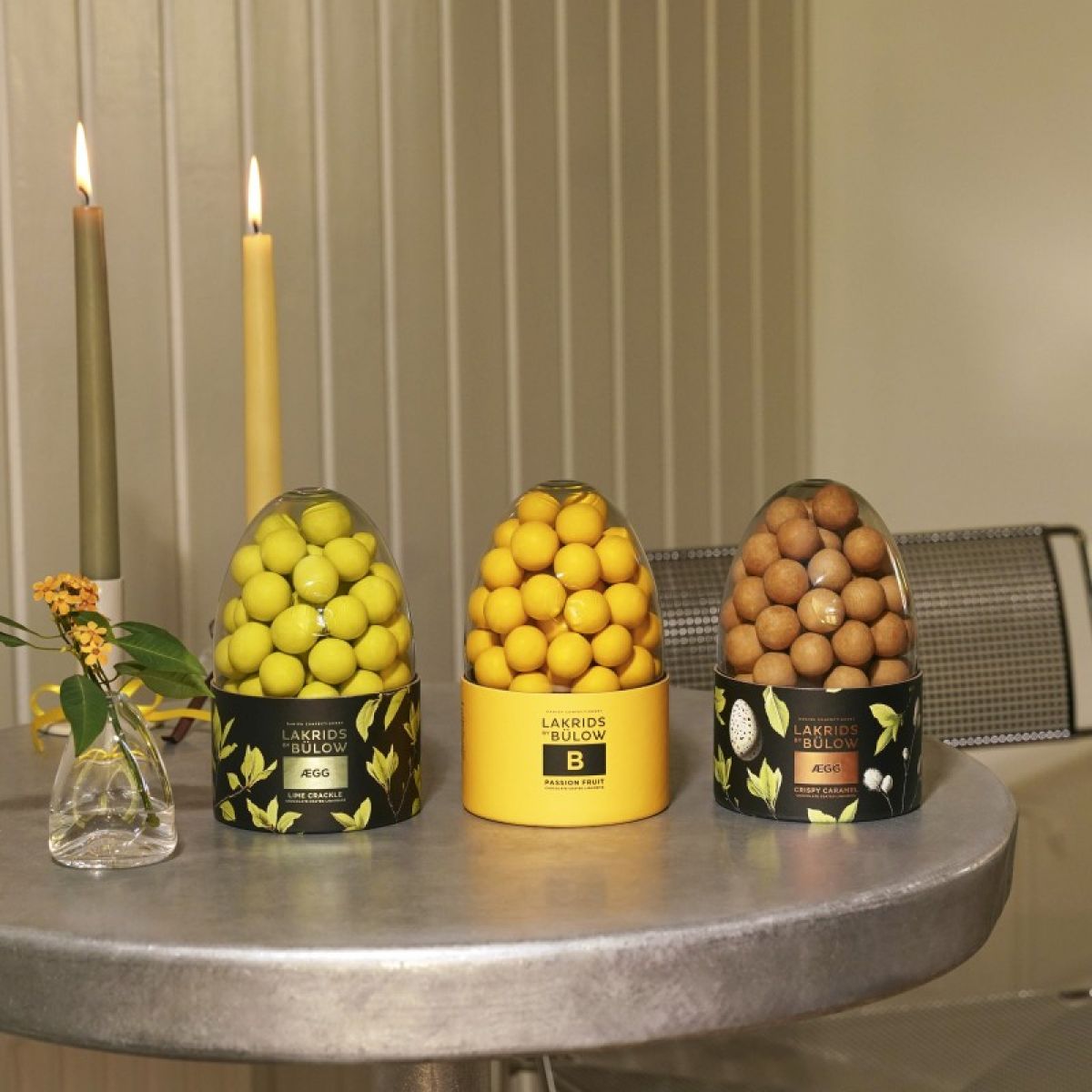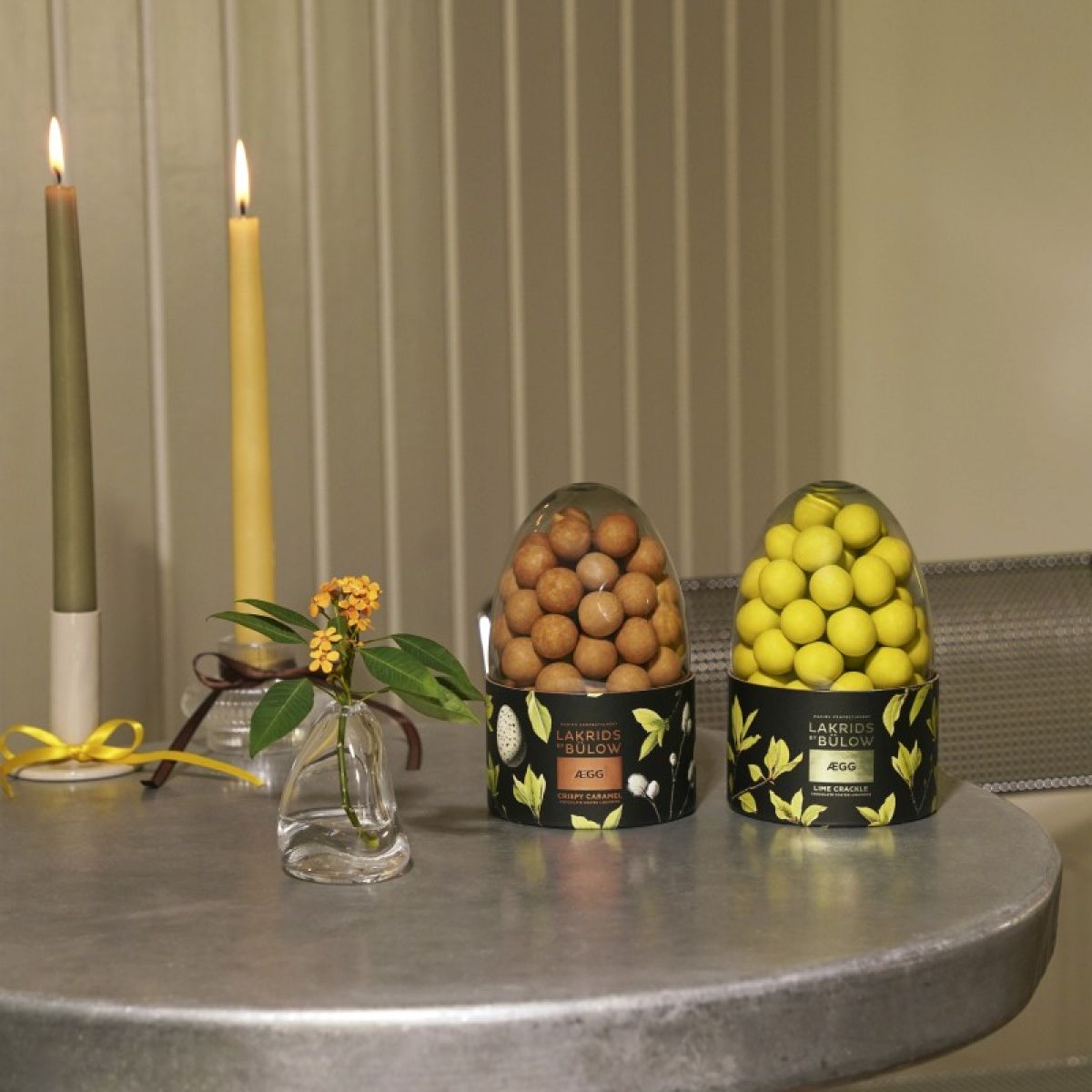 Pakker i en smuk æske, formet som et påskeæg. Med lakrids by Bülow monogram i låget.