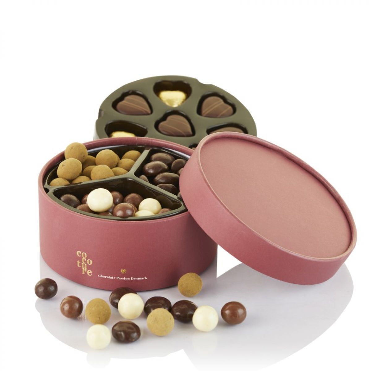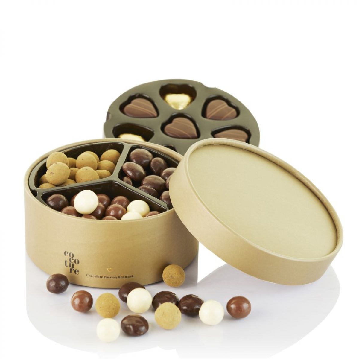 Flot Cocoture hatteæske med 240g mix Marcipanhjerter, Dragéer og gud foliehjerter.