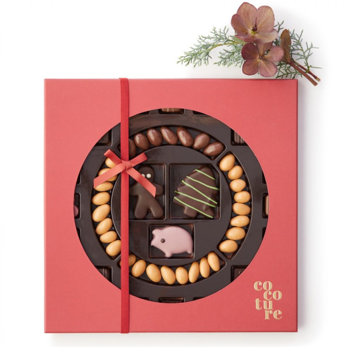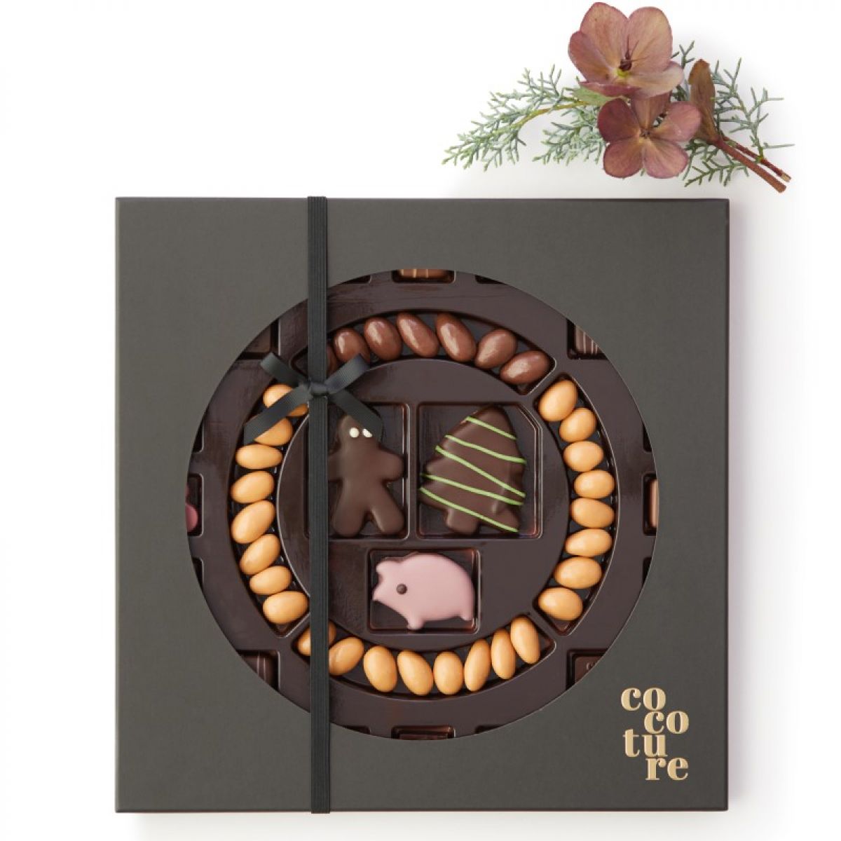 Stor Cocoture Juleæske med marcipanfigurer, fyldte chokolade og dragévarer.