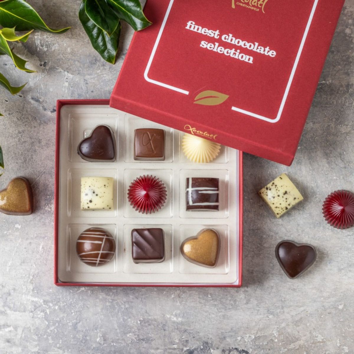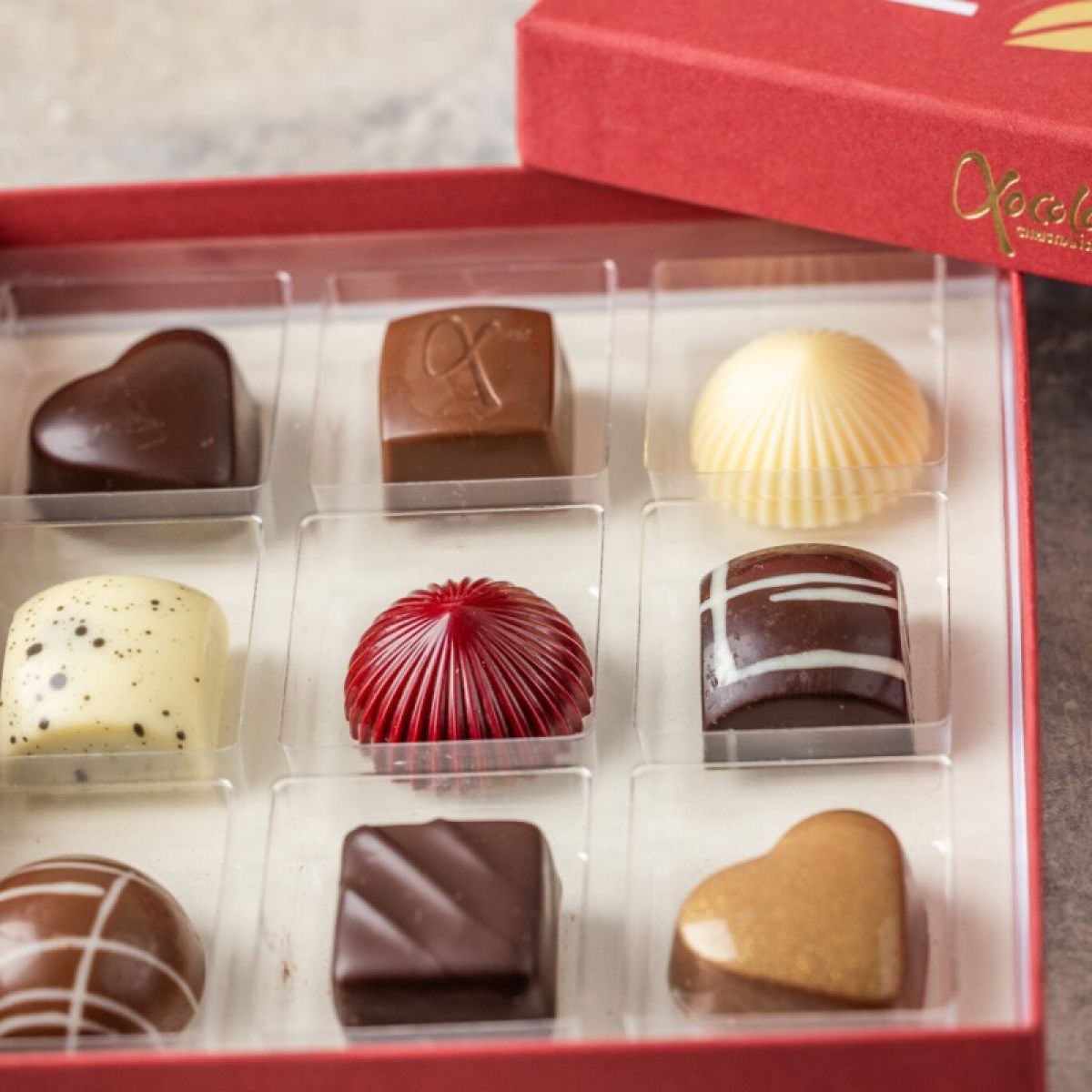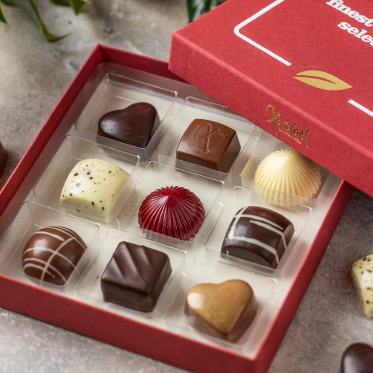 Rød lukket gaveæske med 9 fyldte chokolader.