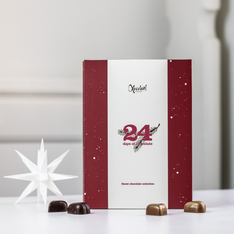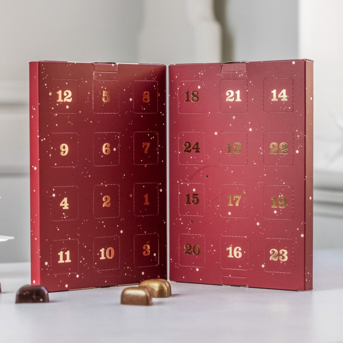 I snow crystal calendar diamonds får du 24 fyldte chokolader med appelsin, lakrids, mint, nougat, saltkaramel, citron og flødekaramel, som er gemt bag 24 små fine låger.