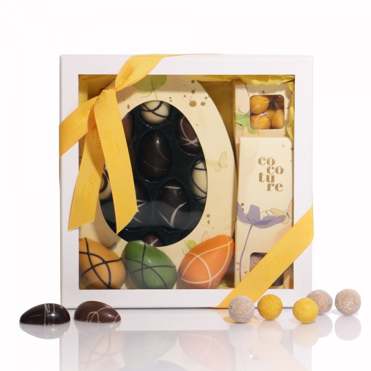 • 132g 11 stk. fyldte chokoladeæg i gul Cocoture medium easter æske