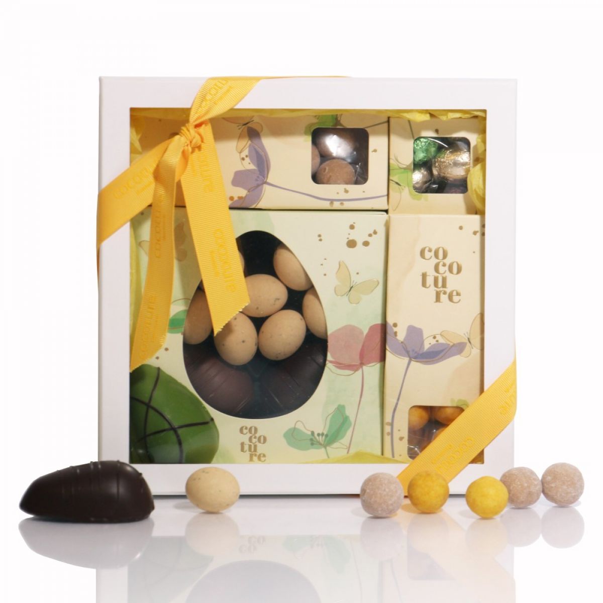 • 55-60g assort små fylde chokoladeæg indpakket i folie i gul Cocoture dragébox
