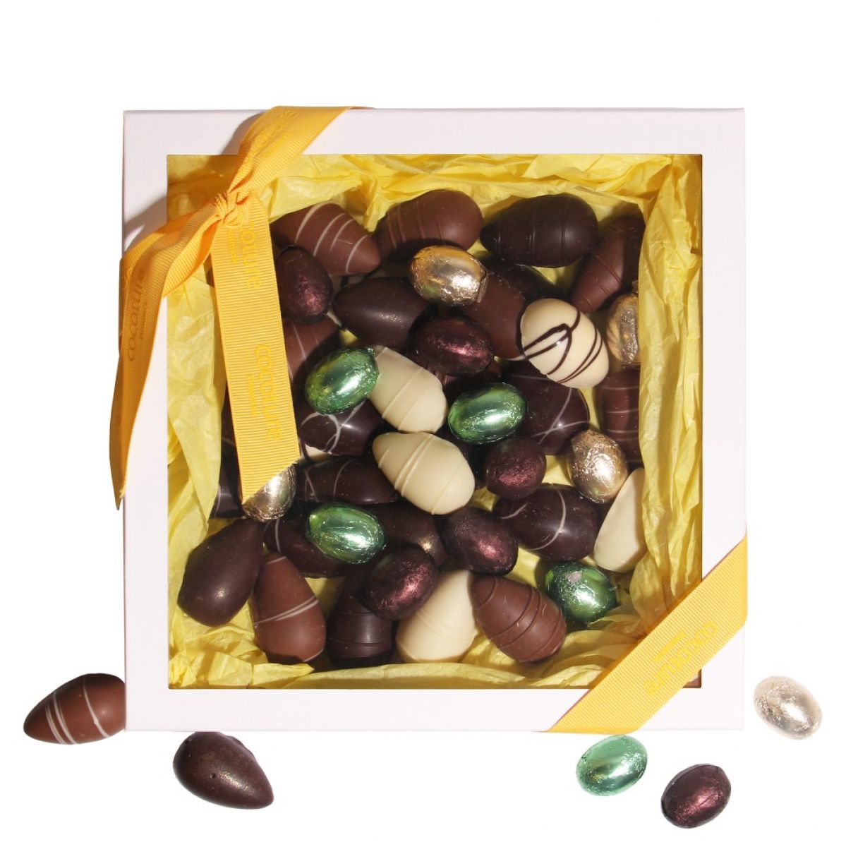 480g mix af fyldte chokoladeæg, marcipanæg og små fyldte chokoladeæg indpakket i folie.