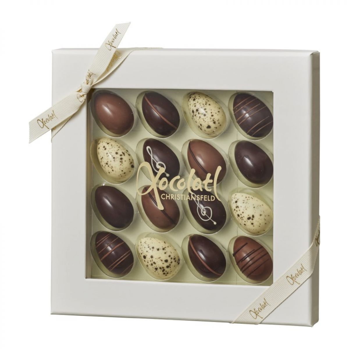 Gaveæske med 16 hånddekorerede marcipanæg overtrukket med enten 70% mørk chokolade, mælkechokolade eller hvid chokolade. Forskellige smagsvarianter med klassisk marcipan, lakrids, solbær, citron og kokos