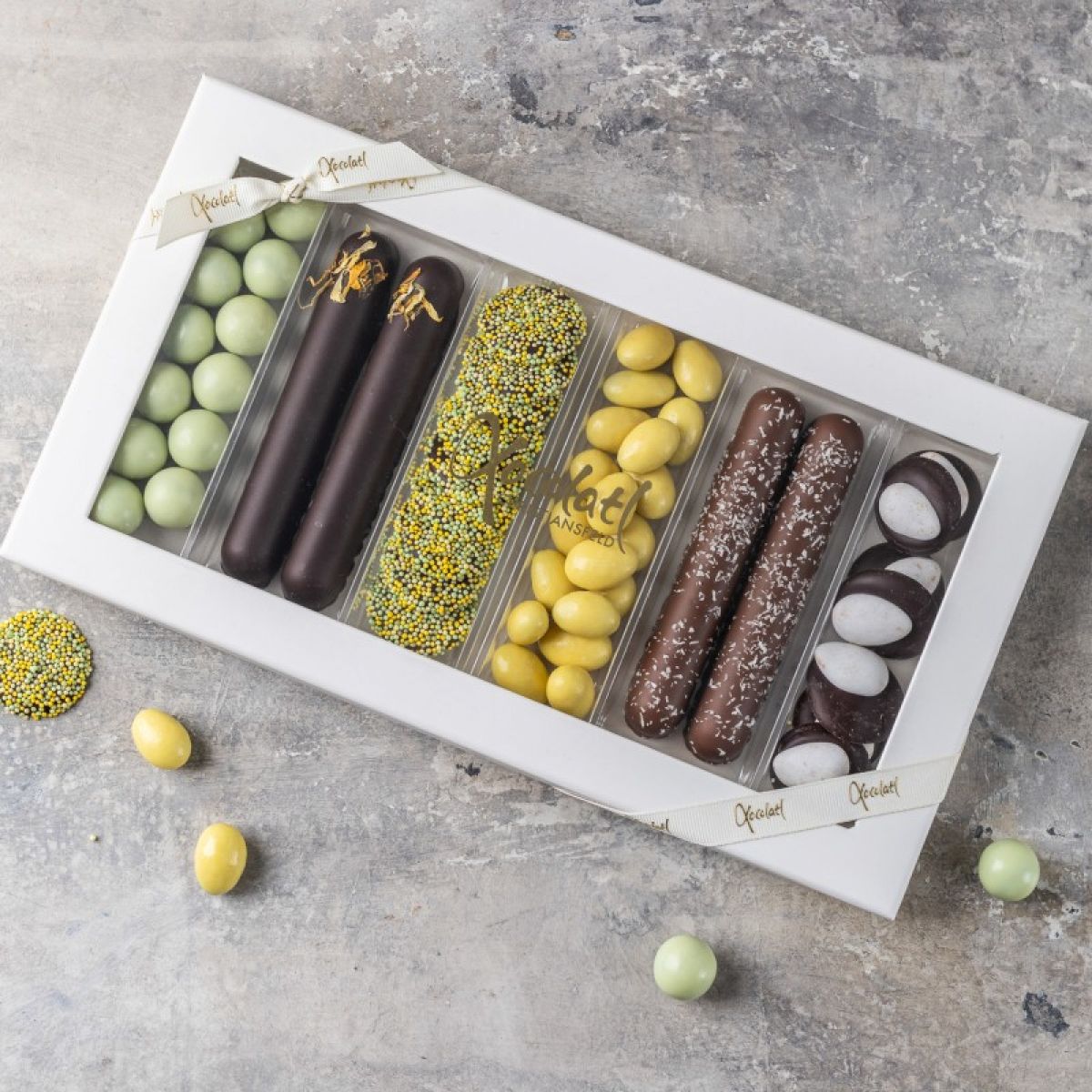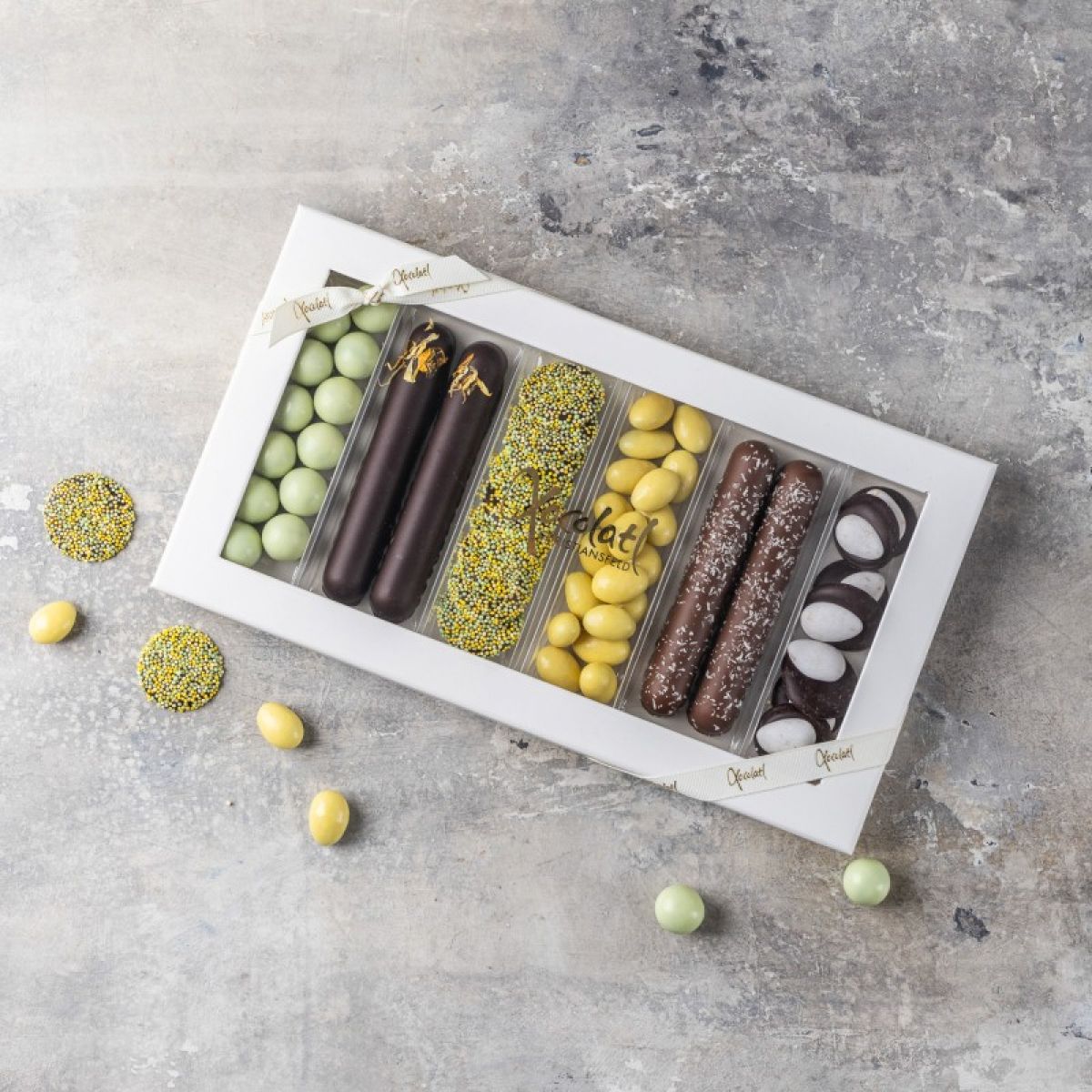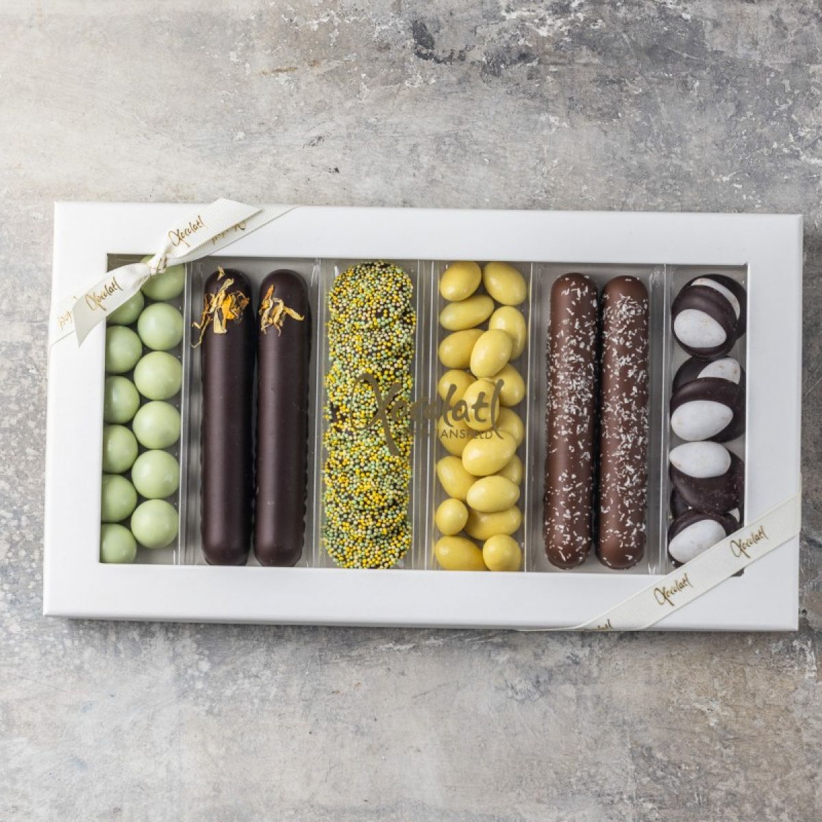 Lakrids med hvid chokolade og lime, marcipanstænger overtrukket med mørk chokolade, chokoladepoletter med karamelfyld, sprøde mandler med hvid chokolade og passionsfrugt, marcipan stænger med mælkechokolade og kokos, samt mørke chokoladepoletter med sprøde dronningemandler.