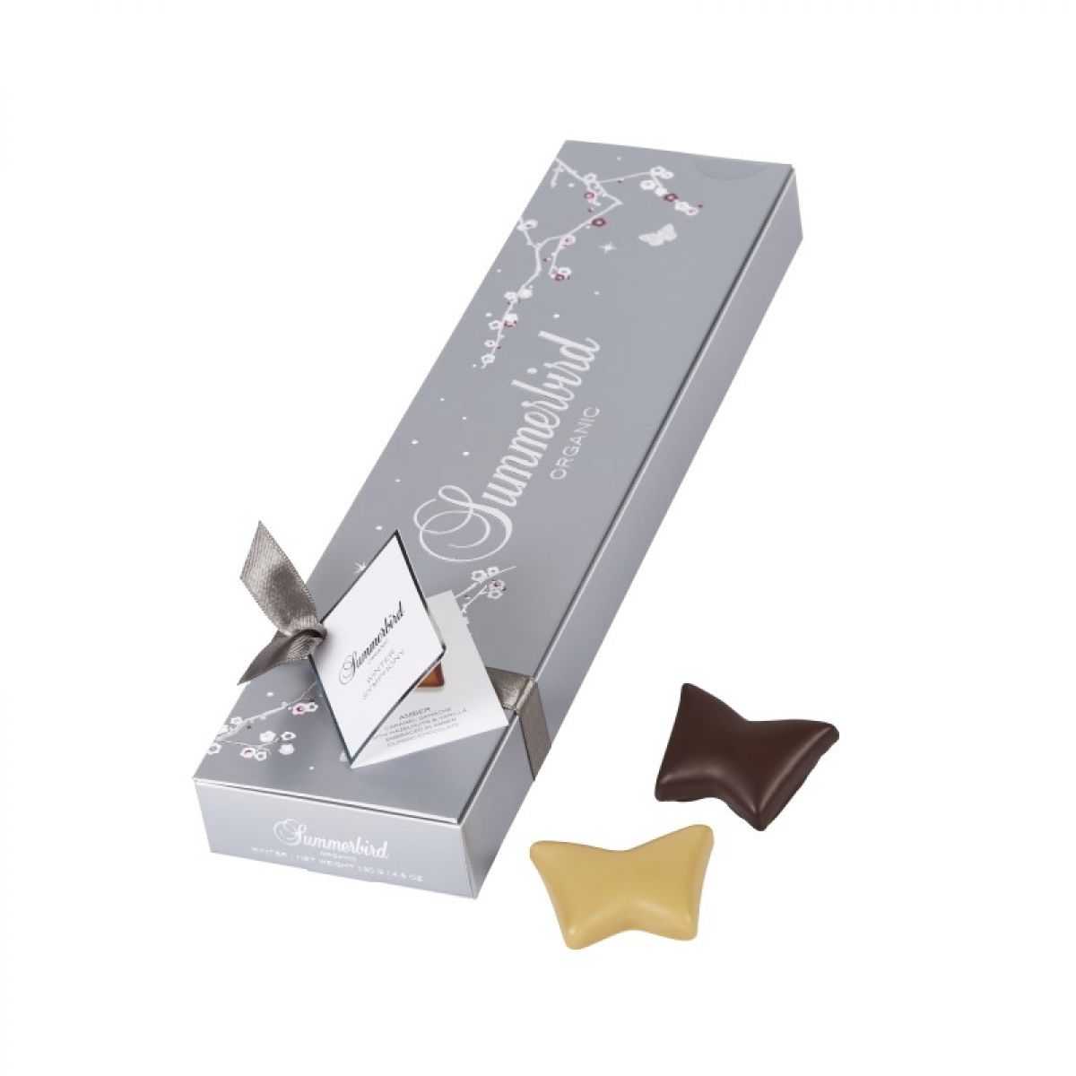 Vores to ikoniske chokoladesommerfugle, Pure Amande og Amber, samlet i en smuk gaveæske.