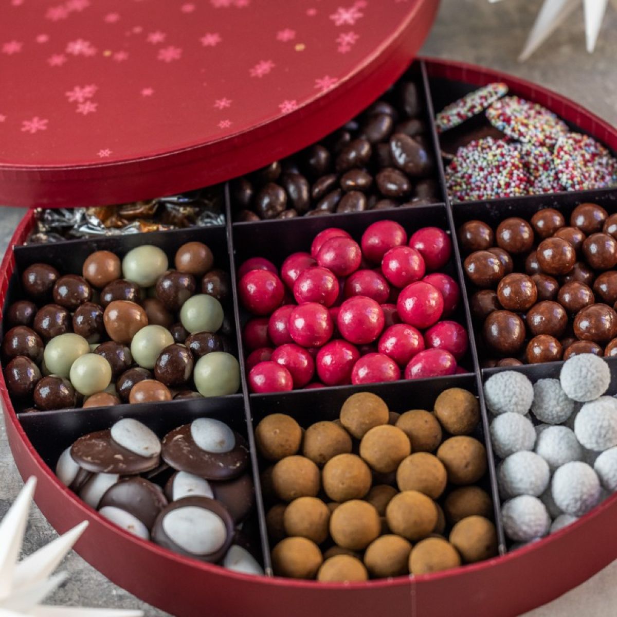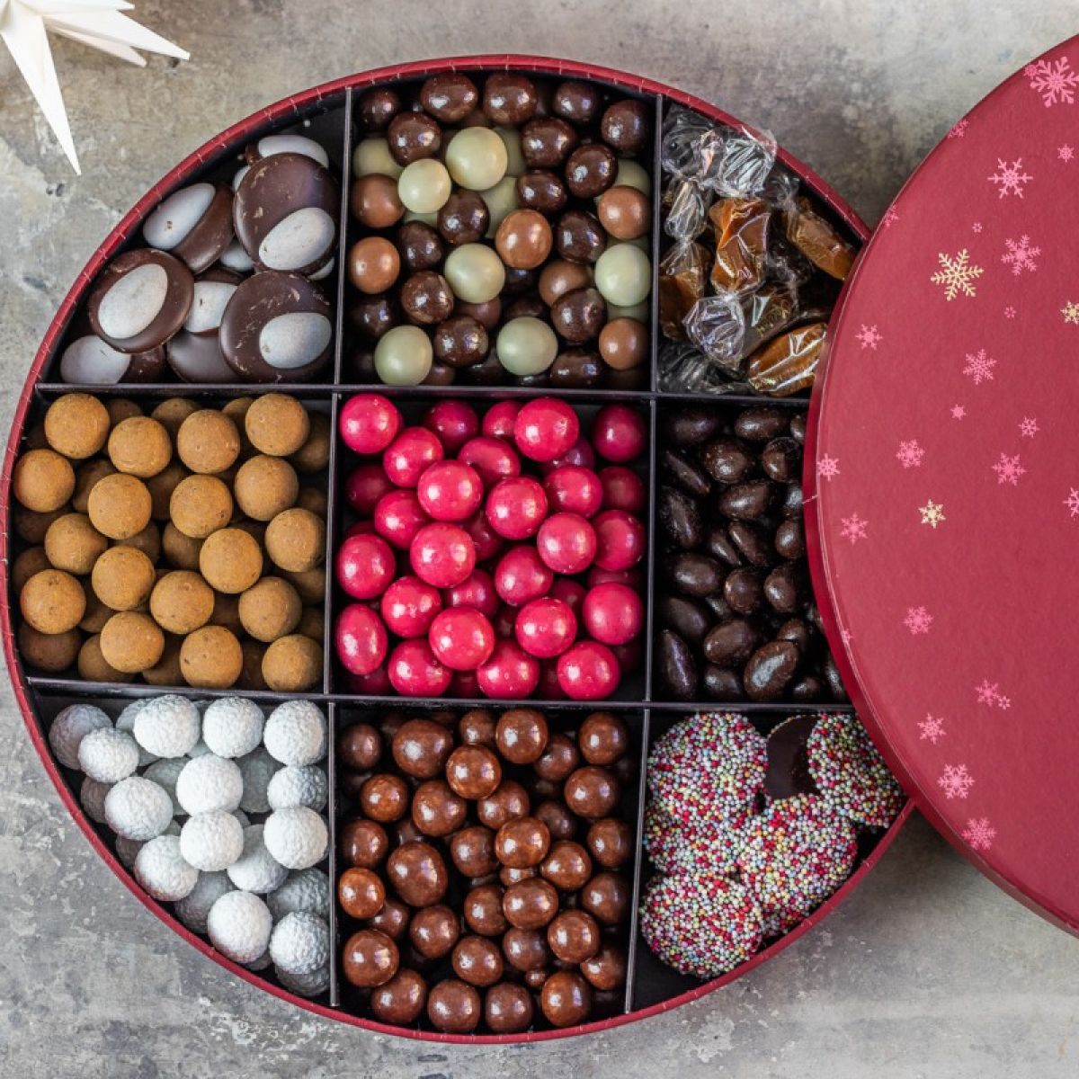 Sprøde kiksekugler med chokolade, snebolde, karameller, chokoladelakrids, hindbærlakrids,